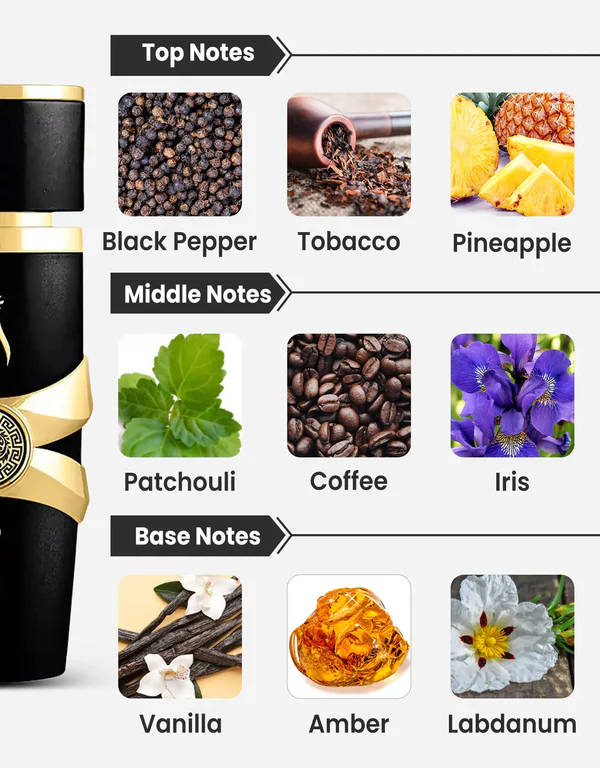 Ananas piperat, iris pudrat, note balsamice, note gurmande de cafea și vanilie, lemn nobil și o umbră misterioasă de tutun îți vor scoate în evidență masculinitatea și farmecul personal!