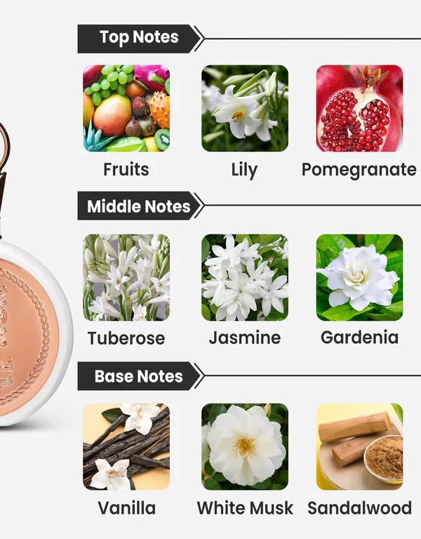 • Note de mijloc: Trandafir, Iasomie, Caprifoi, Tuberoză, Bujor, Gardenie.