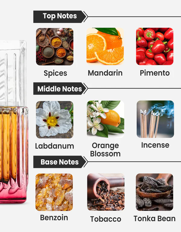 Notele de bază îmbracă pielea într-un val senzual și persistent de tutun, ambră, boabe de tonka, benzoină și o atingere gurmandă de pralină, oferind parfumului o semnătură memorabilă și irezistibilă.